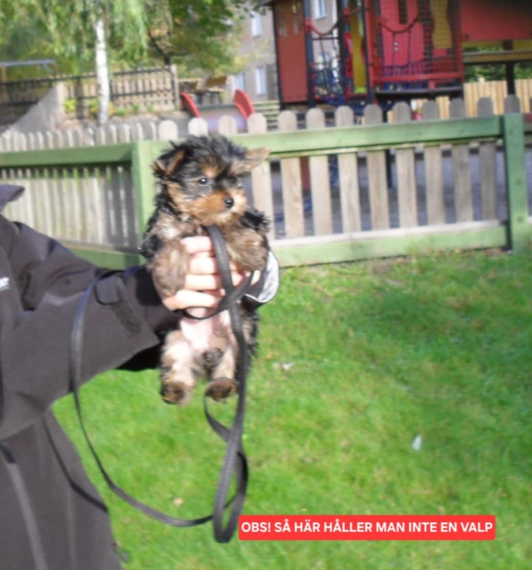 På bilden ovan visar vi hur man INTE ska bära eller hålla en valp. Bara för att den är liten och lätt så måste man ändå lyfta upp den och bära den på ett betryggande sätt.